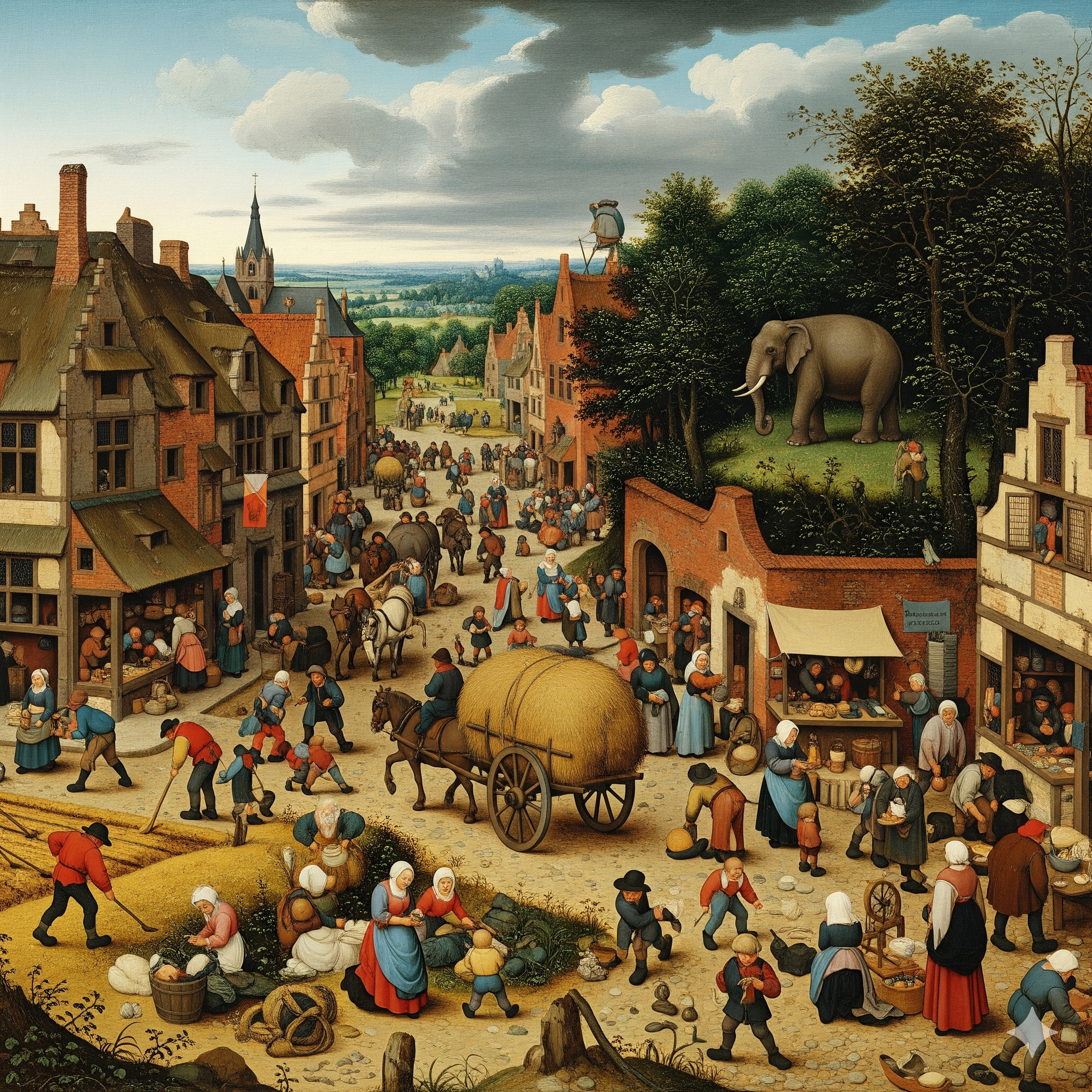 Una ciudad medieval llena de gente que se dedican a lo suyo sin notar a un elefante.